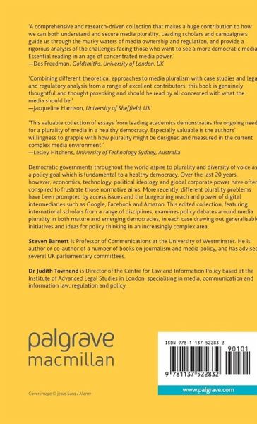 Introduction; Steven Barnett and Judith Townend 1. What is 'Sufficient' Plurality?; Thomas Gibbons 2 Diversity, Distribution and Definitions of 'Media'; Lorna Woods 3. Plurality and Public Service Broadcasting: Why and How PSBs Deserve Protection; Steven Barnett 4. Plurality and Local Media; Martin Moore 5. Hyperlocal media and the News Marketplace; Judith Townend 6. Media Ownership and the Political Economy of Research in US Media Policymaking; Philip Napoli 7. From Media Policy to 'Big' Media Policy: the Battle for Pluralism in Australia; Benedetta Brevini 8. Media Plurality: What Can the European Union Do?; Alison Harcourt 9. Transferable Media Pluralism Policies from Europe; Peter Humphreys 10. Media Plurality in France; Raymond Kuhn 11. Media Subsidies - Editorial Independence Compromised?; Josef Trappel 12. Putting Ends and Means in the Right Place: Media Pluralism Policies in Central and Eastern Europe; Beata Klimkiewicz