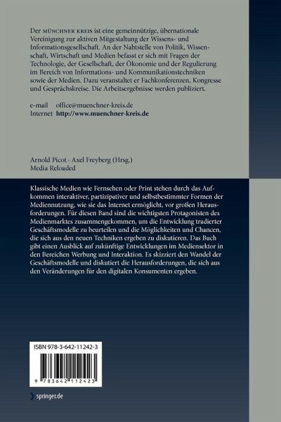 1 Das Internet als Medien-Transformator 1.- Prof. Dr. Jörg Eberspächer, Technische Universität, München.- DIGITALE MEDIEN - MEDIENNUTZUNG IM UMBRUCH.- Moderation: Prof. Dr. Jörg Eberspächer, Technische Universität München.- 2 Digitale Medien - Der Kampf ums Wohnzimmer und darüber hinaus.- 5 Dr. Martin Fabel, A.T. Kearney GmbH, Berlin.- 3 Mediennutzung im Wandel - Analyse und Aussichten 19. Dalia Das, Bertelsmann AG, Gütersloh. - 4 Neue Kanäle, neue Inhalte: User Generated Content oder wie man sich die Energie der Kunden zunutze machen kann.- 33 Prof. Dr. Thomas Hess, LMU München.- 5 ROUNDTABLE: Broadcast vs. On-Demand - Das Ende des klassischen Medienkonsums? 43 Moderation: Dr. Martin Fabel, A.T.Kearney GmbH, Berlin.- Teilnehmer: Robert Amlung, ZDF, Mainz, Barbara Daliri Freyduni, Google Germany GmbH, Hamburg, Florian Landgraf, Kabel Deutschland GmbH, Unterföhring, Andreas Müller-Schubert, Microsoft Deutschland GmbH, Unterschleißheim, Marc Schröder, RTL Interactive GmbH, Köln.- NEUE GESCHÄFTSMODELLE - MEDIENLANDSCHAFT IM UMBRUCH.- Moderation: Dr. Andreas Bereczky, Zweites Deutsches Fernsehen, Mainz.- 6 Die Medienlandschaft in 10 Jahren 67.- Sascha Lobo, adnation Social Media Advertising, Berlin.- VIII Inhalt.- 7 Digitale Werbung - Schöne neue Welt!? 77, Dr. Peter Figge, Tribal DDB GmbH.- 8 Neue Geschäftsmodelle aus der Konvergenz der Medien - Transaktions- und Werbeumsätze treiben das Zusammenwachsen der Medien und Kommunikationsindustrie 85, Jochen Apel, Alcatel-Lucent Deutschland AG, Berlin. - 9 Von Obama lernen, heißt siegen lernen? Rahmenbedingungen für Wahlkämpfe in Deutschland 95, Matthias Jung, Forschungsgruppe Wahlen e.V., Mannheim. - 10 ROUNDTABLE: Der digitale Konsument - Herausforderungen für Politik und Gesellschaft 103, Moderation: Prof. Dr. Arnold Picot, Ludwig-Maximilians-Universität, München, Teilnehmer: Marc Jan Eumann, MdL, SPD-Landtagsfraktion NRW, Düsseldorf, Karl Michael Friedrich, Vodafone GroupResearch & Development, München Prof. Peter Kabel, Unternehmer, Hamburg, Dr. Clemens Riedl, StudiVZ Limited, Berlin, Rainer Tief, Bayerischer Rundfunk, München. - 11 Schlusswort 123, Prof. Dr. Arnold Picot, Ludwig-Maximilians-Universität, München. - Anhang 125. - Liste der Referenten und Moderatoren.