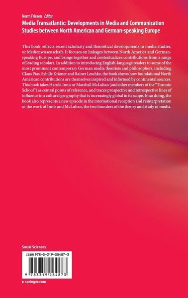 Introduction: The Geopolitics of Media Studies; Richard Cavell and Norm Friesen.- Part I. Theory and Nationality of Media.- What's German about German Media Theory?; Claus Pia.- Disciplining Media Studies: An Expanding Field and Its (Self-) Definition; Jens Schröter.- Part II. McLuhan Transatlantic.- Anonymous Historiography: A Metaphorology of the Constellation in Benjamin, Giedion and McLuhan; Norm Friesen.- Giedion and Explorations: Confluences of Space and Media in Toronto School Theorization; Michael Darroch.- .- Part III. Greek Recursions.- Innis and Kittler: the Case of the Greek Alphabet; Till Heilmann.- Chapter 6. Between Orality and Literacy: Plato's Hybrid Medium; Twyla Gibson.- Part IV. Materiality and Ontology.- Innis in the Concertgebouw: Media and Musical Culture in Nineteenth-Century in Amsterdam; Darryl Cressman.- Meta/ Dia: Two Approaches to the Medial: Dieter Mersch.- Part V. New Directions.- McLuhan and Medienwissenschaften: Sense and Sensation; Rainer Leschke.- The Messenger as a Model in Media Theory: Reflections on the Philosophical Dimensions of Theorizing Media; Sybille Krämer.