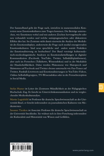Der Sammelband geht der Frage nach, inwiefern in massenmedialen Kontexten neue Emotionskulturen zum Tragen kommen. Die Beiträge untersuchen, wie Emotionen verbal und mit anderen Zeichen hervorgebracht oder neu verhandelt werden und welche soziopragmatischen oder diskursiven Effekte dies hat. Im Zentrum steht damit einerseits die Analyse der Medialität des Emotionsdisplays, andererseits die Frage nach medial emergierenden Emotionskulturen: Sind neue sprachliche und andere soziale Praktiken der Emotionalisierung zu beobachten? Der Band vereinigt kulturanalytisch-medienlinguistische Analysen zu Emotionsdarstellungen in digitaler Kommunikation (Facebook, YouTube, Twitter, Selbsthilfeplattformen), aber auch im Fernsehen (Talkshows, Wissensdokus) und in der Medialität der Handschriftlichkeit. Dabei werden Phänomene wie Hatespeech und Shitstorms auf Facebook und Twitter ebenso untersucht wie Fan-Trauer auf Twitter, Fussball-Livetweets und Emotionalisierungen in YouTube-Videos, Online-Selbsthilfegruppen, TV-Wissensdokus oder in der Fernsehrezeption in Social Media.