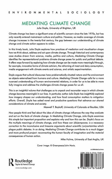 Climate change has been a significant area of scientific concern since the late 1970s, but has only recently entered mainstream culture and politics. However, as media coverage of climate change increases in the twenty-first century, the gap between our understanding of climate change and climate action appears to widen. In this timely book, Julie Doyle explores how practices of mediation and visualisation shape how we think about, address and act upon climate change. Through historical and contemporary case studies drawn from science, media, politics and culture, Mediating Climate Change identifies the representational problems climate change poses for public and political debate. It offers ways forward by exploring how climate change can be made more meaningful through, for example, innovative forms of climate activism, the reframing of meat and dairy consumption, media engagement with climate events and science, and artistic experimentation. Doyle argues that cultural discourses have problematically situated nature and the environment as objects externalised from humans and culture. Mediating Climate Change calls for a more nuanced understanding of human-environmental relations, in order for us to be able to more fully imagine and address the challenges climate change poses for us all.