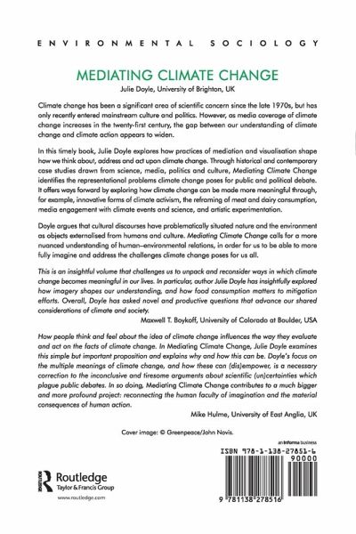Climate change has been a significant area of scientific concern since the late 1970s, but has only recently entered mainstream culture and politics. However, as media coverage of climate change increases in the twenty-first century, the gap between our understanding of climate change and climate action appears to widen. In this timely book, Julie Doyle explores how practices of mediation and visualisation shape how we think about, address and act upon climate change. Through historical and contemporary case studies drawn from science, media, politics and culture, Mediating Climate Change identifies the representational problems climate change poses for public and political debate. It offers ways forward by exploring how climate change can be made more meaningful through, for example, innovative forms of climate activism, the reframing of meat and dairy consumption, media engagement with climate events and science, and artistic experimentation. Doyle argues that cultural discourses have problematically situated nature and the environment as objects externalised from humans and culture. Mediating Climate Change calls for a more nuanced understanding of human-environmental relations, in order for us to be able to more fully imagine and address the challenges climate change poses for us all.