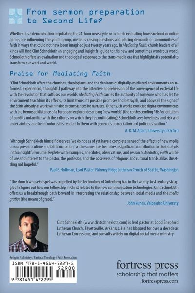 The church struggles with media. Whether it is a denomination negotiating the 24-hour news cycle or a church evaluating how online games influence the youth group, the role of media in the church, and the importance of understanding media for the church, has never been greater. In Mediating Faith, Clint Schnekloth offers an insightful tour, evaluation, and theological response to the trans-media era. Far from frightening, Schnekloth highlights the opportunities and the riches of this fascinating time.