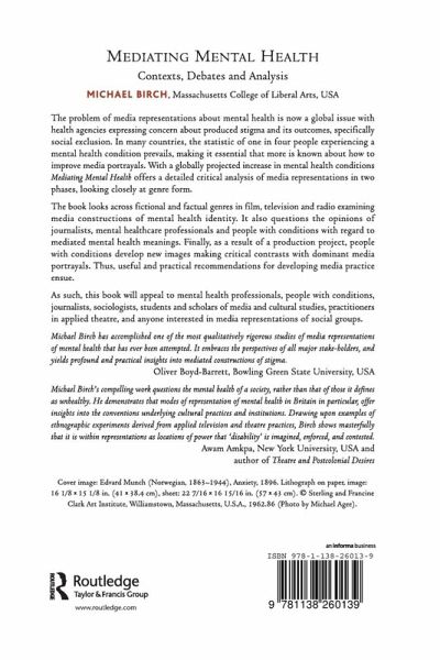 The problem of media representations about mental health is now a global issue with health agencies expressing concern about produced stigma and its outcomes, specifically social exclusion. In many countries, the statistic of one in four people experiencing a mental health condition prevails, making it essential that more is known about how to improve media portrayals. With a globally projected increase in mental health conditions Mediating Mental Health offers a detailed critical analysis of media representations in two phases looking closely at genre form. The book looks across fictional and factual genres in film, television and radio examining media constructions of mental health identity. It also questions the opinions of journalists, mental healthcare professionals and people with conditions with regard to mediated mental health meanings. Finally, as a result of a production project, people with conditions develop new images making critical contrasts with dominant media portrayals. Thus, useful and practical recommendations for developing media practice ensue. As such, this book will appeal to mental health professionals, people with conditions, journalists, sociologists, students and scholars of media and cultural studies, practitioners in applied theatre, and anyone interested in media representations of social groups.
