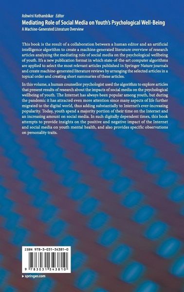 This book is the result of a collaboration between a human editor and an artificial intelligence algorithm to create a machine-generated literature overview of research articles analyzing the mediating role of social media on the psychological wellbeing of youth. It's a new publication format in which state-of-the-art computer algorithms are applied to select the most relevant articles published in Springer Nature journals and create machine-generated literature reviews by arranging the selected articles in a topical order and creating short summaries of these articles.