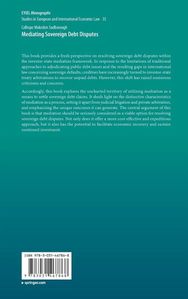 Accordingly, this book explores the uncharted territory of utilizing mediation as a means to settle sovereign debt claims. It sheds light on the distinctive characteristics of mediation as a process, setting it apart from judicial litigation and private arbitration, and emphasizing the unique outcomes it can generate. The central argument of this book is that mediation should be seriously considered as a viable option for resolving sovereign debt disputes. Not only does it offer a more cost-effective and expeditious approach, but it also has the potential to facilitate economic recovery and sustain continued investment.