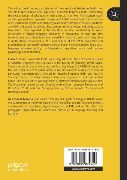 This edited book presents a selection of new empirical studies in English for Specific Purposes (ESP) and English for Academic Purposes (EAP), showcasing the best practices of educators in their particular contexts. The chapters cover settings grouped into three main categories: L2 abilities and English as a medium of instruction in English/Spanish bilingual contexts; ESP in international contexts; and EAP and academic writing. The authors examine topics and contexts that have been under-explored in the literature to date, contributing to wider discussions of English-language mediation in educational settings and also touching on areas such as international mobility, migration, and social integration in multicultural environments. This book will be of interest to academics and practitioners in an interdisciplinary range of fields, including applied linguistics, language education policy, multilingualism, migration policy, and positive psychology and motivation.
