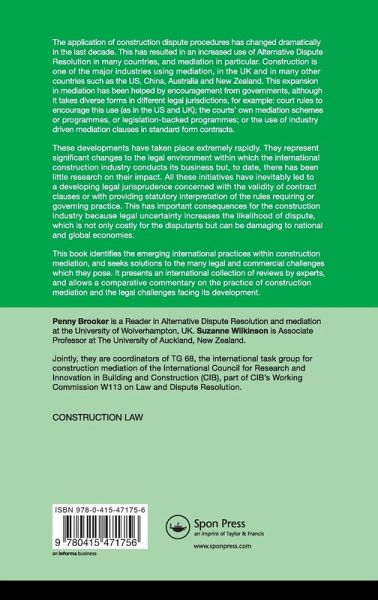 Penny Brooker is a Reader in Alternative Dispute Resolution and mediation at the University of Wolverhampton, UK. Suzanne Wilkinson is Associate Professor at The University of Auckland, New Zealand. Jointly, they are coordinators of TG 68, the international task group for construction mediation of the International Council for Research and Innovation in Building and Construction (CIB), part of CIB's Working Commission W113 on Law and Dispute Resolution.