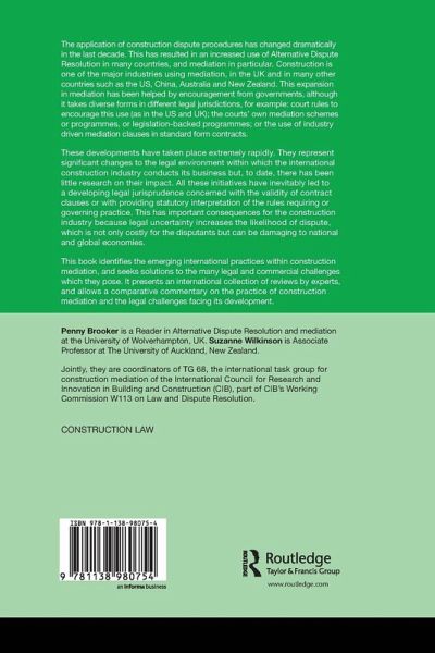 Penny Brooker is a Reader in Alternative Dispute Resolution and mediation at the University of Wolverhampton, UK. Suzanne Wilkinson is Associate Professor at The University of Auckland, New Zealand. Jointly, they are coordinators of TG 68, the international task group for construction mediation of the International Council for Research and Innovation in Building and Construction (CIB), part of CIB's Working Commission W113 on Law and Dispute Resolution.