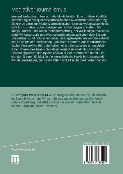 Irmgard Wetzstein untersucht die Möglichkeiten konstruktiver Konfliktbearbeitung in der qualitätsjournalistischen Auslandsberichterstattung. Sie grenzt diese zur friedensjournalistischen Idee ab, wobei systemische bzw. konstruktivistische Überlegungen im Vordergrund stehen. Die Kriegs-, Krisen- und Konfliktberichterstattung, der Auslandsjournalismus, seine Wirkpotenziale und Wechselbeziehungen zwischen dem System Journalismus und politischen EntscheidungsträgerInnen werden anhand des Konzepts der öffentlichen Diplomatie erläutert. Aus konflikttheoretischer Perspektive führt die Autorin eine Inhaltsanalyse unterschiedlicher Phasen des israelisch-palästinensischen Konflikts sowie der Unabhängigkeitserklärung des Kosovo in vier Printmedien durch. Sie gibt damit einen Einblick in die journalistische Praxis im Umgang mit Konfliktereignissen, die für die Öffentlichkeit nicht direkt erfahrbar sind.