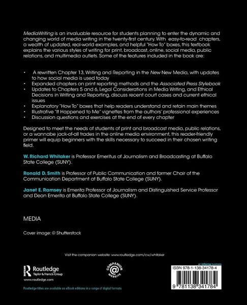 MediaWriting is an invaluable resource for students planning to enter the dynamic and changing world of media writing in the twenty-first century. With easy-to-read chapters, a wealth of updated, real-world examples, and helpful "How To" boxes throughout, this textbook explains the various styles of writing for print, broadcast, online, social media, public relations, and multimedia outlets. Some of the features included in the book are: A re-written Chapter 13, Writing and Reporting in the New New Media, with updates to how social media is used today Expanded chapters on print reporting methods and the Associated Press Stylebook Updates to Chapters 5 and 6, Legal Considerations in Media Writing, and Ethical Decisions in Writing and Reporting, discuss recent court cases and current ethical issues Explanatory "How To" boxes that help readers understand and retain main themes Illustrative "It Happened to Me" vignettes from the authors' professional experiences Discussion questions and exercises at the end of every chapter Designed to meet the needs of students of print and broadcast media, public relations, or a wannabe jack-of-all trades in the online media environment, this reader-friendly primer will equip beginners with the skills necessary to succeed in their chosen writing field.