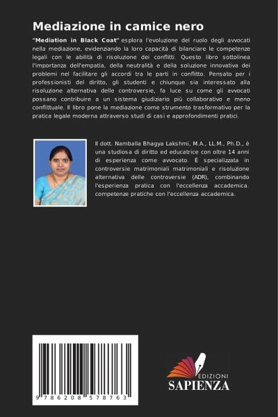 "Mediation in Black Coat" esplora l'evoluzione del ruolo degli avvocati nella mediazione, evidenziando la loro capacità di bilanciare le competenze legali con le abilità di risoluzione dei conflitti. Questo libro sottolinea l'importanza dell'empatia, della neutralità e della soluzione innovativa dei problemi nel facilitare gli accordi tra le parti in conflitto. Pensato per i professionisti del diritto, gli studenti e chiunque sia interessato alla risoluzione alternativa delle controversie, fa luce su come gli avvocati possano contribuire a un sistema giudiziario più collaborativo e meno conflittuale. Il libro pone la mediazione come strumento trasformativo per la pratica legale moderna attraverso studi di casi e approfondimenti pratici.