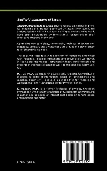 A careful review of the literature covering various aspects of applications of lasers in science and technology reveals that lasers are being applied very widely throughout the entire gamut of physical medicine. After surveying the current developments taking place in the field of medical applications of lasers, it was considered appropriate to bring together these efforts of international research scientists and experts into one volume. It is with this aim that the editors have prepared this volume which brings current research and recent developments to the attention of a wide spectrum of readership associated with hospitals, medical institutions and universities world wide, including also the medical instrument industry. Both teachers and students in the medical faculties will especially find this compendium quite useful. This book is comprised of eleven chapters. All of the important medical applications of lasers are featured. The editors have made every effort that individual chapters are self-contained and written by experts. Emphasis has been placed on straight and simple presentation of the subject matter so that even the new entrants into the field will find the book of value.