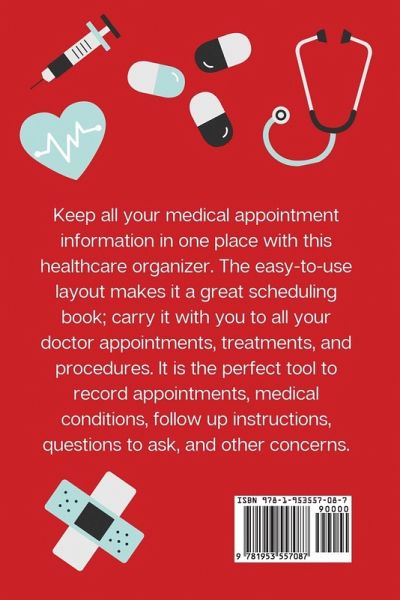 Keep all your medical appointment information in one place with this healthcare organizer. The easy-to-use layout makes it a great scheduling book; carry it with you to all your doctor appointments, treatments, and procedures. It is the perfect tool to record appointments, medical conditions, follow up instructions, questions to ask, and other concerns. Features:Appointment date, time, and place Medical Consultant/Specialist Name Phone number Address Main concerns Additional concerns Follow up information Next appointment Plenty of room to write your notes and instructions Details:Pages- 124 Size- 6"x 9" Paperback Matte finish Makes a great organizer for anyone who wants to keep track of their medical information for doctor/medical appointments, treatments, and procedures. Perfect logbook for caregivers, family members, medical support staff. Makes a thoughtful gift for family & friends. Order your copy today!