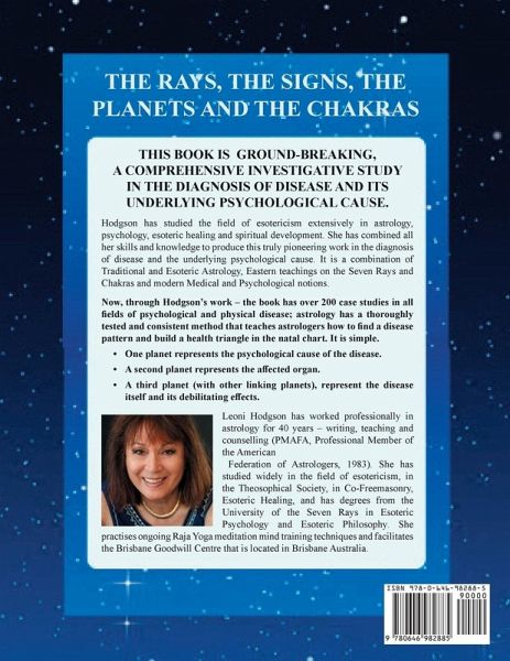 This Medical Astrology book is remarkable because it merges Traditional Astrology seamlessly with modern Western Medical and Psychological notions and with Eastern Wisdom such as the Seven Ray energies, the Etheric Chakra system and Spiritual Evolution. Hodgson has drawn on 40 years of experience working professionally in astrology – writing, teaching and counselling (PMAFA, Professional Member of the American Federation of Astrologers, 1983); and in studying Esoteric Philosophy, Esoteric Psychology, Esoteric Healing. and Raja Yoga to produce this amazing book. A method to find a disease pattern in the natal chart is given. Planets are triangulated and this method is carefully explained with over 200 case studies to demonstrate how it works. The first point represents the cause of the disease. The second the organ affected. The third point represents the disease itself and its effect. The first part of the book has a section dedicated to each of the signs, planets, rays and chakras. The layout is easy to follow and includes many anatomical drawings and diagrams that are specific to diseased areas of the body. All astrologers, esoteric healers and workers will benefit by having this extraordinary book on their shelves. So will anyone interested in the correlation between psychology and disease.