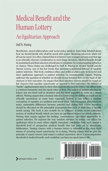 This book combines ethics and political philosophy in its novel and strict egalitarian approach to patient selection for transplantable organs. Waring addresses the question of whether we should choose between lives on the basis of fair chances or best outcomes. He argues that final selection criteria should be based on fair chances that equalize opportunity as opposed to best outcomes. His defence of "hardy" egalitarianism aims to show that random selection by lottery can affirm both a common humanity and the equal value of lives. The notion of patient selection by lottery has not fared well in bioethics and has been regarded by some as a moral affront. Waring argues that a human selection lottery may be neither as crude nor as ethically anomalous as some have supposed. Indeed, it can reflect a familiar conception of equality as a political and moral ideal. This conception abstracts from many undeniable differences between patients and claims that scarce resources should be allocated on the principled assumption that each of their lives is equally worth saving. The book is also notable for its critiques of some recent utilitarian notions of medical benefit which can have an age-biased impact on elderly patients. Waring then argues against the leading, contemporary age-based approaches to patient selection. He explores the way randomselection by lottery can affirm his egalitarian ethos in cases where eligible transplant candidates have each passed a threshold level of prospective medical benefit that has been set by democratic deliberation. Taming chance with a human lottery is defended as the most lucid means of ensuring equal opportunity. In so doing, Waring argues that we give the principle of equal concern and respect a radical expression: above a noncomparative threshold of medical benefit, each candidate can have an equal claim to life.