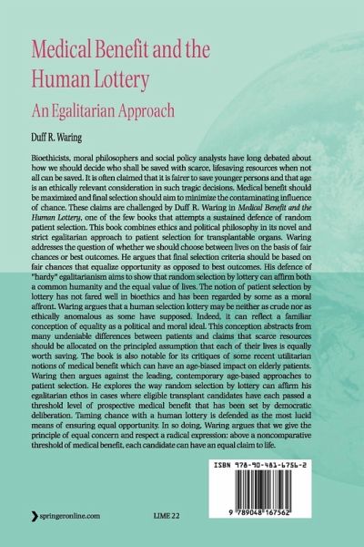 This book combines ethics and political philosophy in its novel and strict egalitarian approach to patient selection for transplantable organs. Waring addresses the question of whether we should choose between lives on the basis of fair chances or best outcomes. He argues that final selection criteria should be based on fair chances that equalize opportunity as opposed to best outcomes. His defence of "hardy" egalitarianism aims to show that random selection by lottery can affirm both a common humanity and the equal value of lives. The notion of patient selection by lottery has not fared well in bioethics and has been regarded by some as a moral affront. Waring argues that a human selection lottery may be neither as crude nor as ethically anomalous as some have supposed. Indeed, it can reflect a familiar conception of equality as a political and moral ideal. This conception abstracts from many undeniable differences between patients and claims that scarce resources should be allocated on the principled assumption that each of their lives is equally worth saving. The book is also notable for its critiques of some recent utilitarian notions of medical benefit which can have an age-biased impact on elderly patients. Waring then argues against the leading, contemporary age-based approaches to patient selection. He explores the way randomselection by lottery can affirm his egalitarian ethos in cases where eligible transplant candidates have each passed a threshold level of prospective medical benefit that has been set by democratic deliberation. Taming chance with a human lottery is defended as the most lucid means of ensuring equal opportunity. In so doing, Waring argues that we give the principle of equal concern and respect a radical expression: above a noncomparative threshold of medical benefit, each candidate can have an equal claim to life.