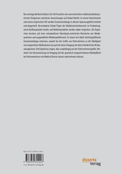 Dieses Buch befasst sich mit Ursachen von unerwünschten medizinproduktassoziierten Ereignissen und deren Auswirkungen auf Global Health. Es beruht auf einem theoretischen und einem empirischen Teil. Zusammenhänge wurden in diesem Spannungsfeld ermittelt und dargestellt. Der Umfang der Studie umfasst im empirischen Teil 1.390 systematisch recherchierte Vorkommnisse und Maßnahmen von Global Player der Medizintechnikbranche im Produktsegment Kardiovaskuläre Geräte und Medizinprodukte. Die Ergebnisse beruhen auf einer retrospektiven Datenbank-zentrierten Recherche von Meldesystemen und ausgewählten Medienplattformen, die mit der Rangkorrelation nach Spearman-Rho und dem Kruskal Wallis Test ausgewertet wurden. Es zeigen sich nach der Auswertung höchstsignifikante Zusammenhänge, sowohl bei der Größe von Unternehmen zu der Häufigkeit von eingeleiteten Maßnahmen als auch bei deren Umgang mit dem erforderlichen Risikomanagement. Die Ergebnisse zeigen, dass unabhängig von Unternehmensgröße, Hersteller ihre Verantwortung im Umgang mit der gesetzlich vorgeschriebenen Meldepflicht bei Vorkommnissen mit Medical Devices besser wahrnehmen müssen. Im Hinblick auf Patientensicherheit und in Bezug auf globale Auswirkungen sind sie weiterhin in der Pflicht, ihre Produkte so sicher wie möglich zu gestalten und einen angemessenen Umgang mit potentiellen Risiken zu finden.