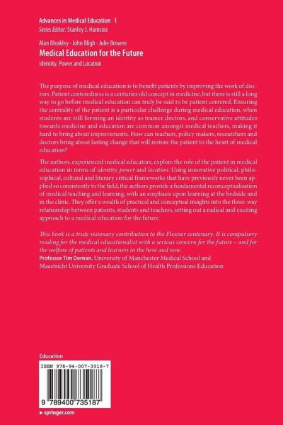 The purpose of medical education is to benefit patients by improving the work of doctors. Patient centeredness is a centuries old concept in medicine, but there is still a long way to go before medical education can truly be said to be patient centered. Ensuring the centrality of the patient is a particular challenge during medical education, when students are still forming an identity as trainee doctors, and conservative attitudes towards medicine and education are common amongst medical teachers, making it hard to bring about improvements. How can teachers, policy makers, researchers and doctors bring about lasting change that will restore the patient to the heart of medical education? The authors, experienced medical educators, explore the role of the patient in medical education in terms of identity, power and location. Using innovative political, philosophical, cultural and literary critical frameworks that have previously never been applied so consistently to the field, theauthors provide a fundamental reconceptualisation of medical teaching and learning, with an emphasis upon learning at the bedside and in the clinic. They offer a wealth of practical and conceptual insights into the three-way relationship between patients, students and teachers, setting out a radical and exciting approach to a medical education for the future.