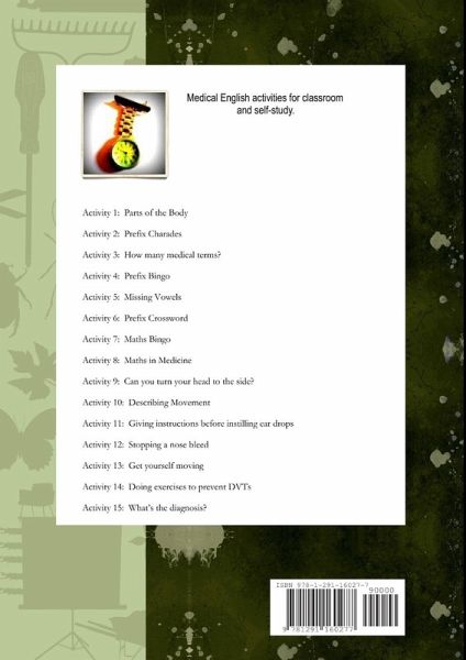 Medical English activities which can be used in the classroom by teachers and for self study by learners. Contents 1: Parts of the Body 2: Prefix Charades 3: How many medical terms? 4: Prefix Bingo 5: Missing Vowels 6: Prefix Crossword 7: Maths Bingo 8: Maths in Medicine 9: Can you turn your head to the side? 10: Describing Movement 11: Giving instructions before instilling ear drops 12: Stopping a nose bleed 13: Get yourself moving 14: Doing exercises to prevent DVTs 15: What's the diagnosis?