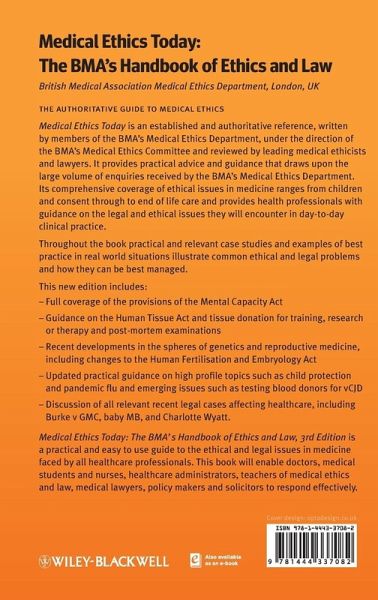 Medical Ethics Today: The BMA's Handbook of Ethics and Law, 3rd Edition is a practical and easy to use guide to the ethical and legal issues in medicine faced by all healthcare professionals. This book will enable doctors, medical students and nurses, healthcare administrators, teachers of medical ethics and law, medical lawyers, policy makers and solicitors to respond effectively. This is your source for authoritative and comprehensive guidance from the British Medical Association (BMA) Medical Ethics Department covering both routine and highly contentious medico-legal issues faced by health care professionals. The new edition updates the information from both the legal and ethical perspectives and reflects developments surrounding The Mental Capacity Act, Human Tissue Act, and revision of the Human Fertilisation and Embryology Act.