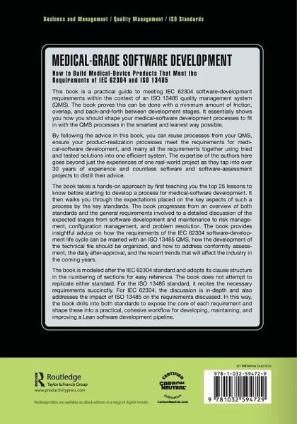 This book is a practical guide to meeting IEC 62304 software-development requirements within the context of an ISO 13485 quality management system (QMS). The book proves this can be done with a minimum amount of friction, overlap, and back-and-forth between development stages. It essentially shows you how you should shape your medical-software development processes to fit in with the QMS processes in the smartest and leanest way possible.