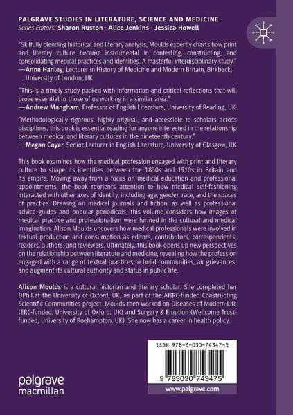 This book examines how the medical profession engaged with print and literary culture to shape its identities between the 1830s and 1910s in Britain and its empire. Moving away from a focus on medical education and professional appointments, the book reorients attention to how medical self-fashioning interacted with other axes of identity, including age, gender, race, and the spaces of practice. Drawing on medical journals and fiction, as well as professional advice guides and popular periodicals, this volume considers how images of medical practice and professionalism were formed in the cultural and medical imagination. Alison Moulds uncovers how medical professionals were involved in textual production and consumption as editors, contributors, correspondents, readers, authors, and reviewers. Ultimately, this book opens up new perspectives on the relationship between literature and medicine, revealing how the profession engaged with a range of textual practices to build communities, air grievances, and augment its cultural authority and status in public life.