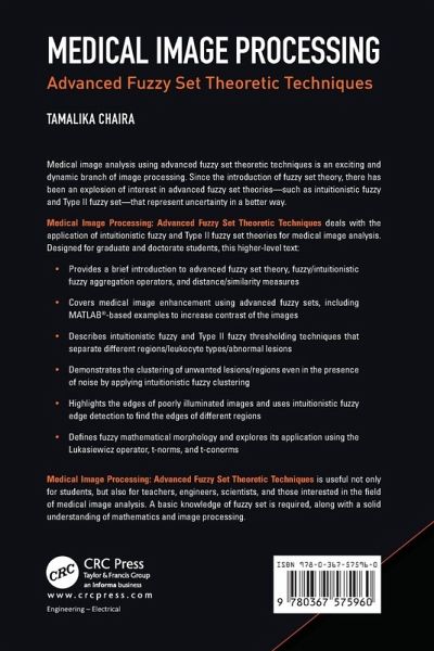 Medical image analysis using advanced fuzzy set theoretic techniques is an exciting and dynamic branch of image processing. Since the introduction of fuzzy set theory, there has been an explosion of interest in advanced fuzzy set theories-such as intuitionistic fuzzy and Type II fuzzy set-that represent uncertainty in a better way. Medical Image Processing: Advanced Fuzzy Set Theoretic Techniques deals with the application of intuitionistic fuzzy and Type II fuzzy set theories for medical image analysis. Designed for graduate and doctorate students, this higher-level text: Provides a brief introduction to advanced fuzzy set theory, fuzzy/intuitionistic fuzzy aggregation operators, and distance/similarity measures Covers medical image enhancement using advanced fuzzy sets, including MATLAB®-based examples to increase contrast of the images Describes intuitionistic fuzzy and Type II fuzzy thresholding techniques that separate different regions/leukocyte types/abnormal lesions Demonstrates the clustering of unwanted lesions/regions even in the presence of noise by applying intuitionistic fuzzy clustering Highlights the edges of poorly illuminated images and uses intuitionistic fuzzy edge detection to find the edges of different regions Defines fuzzy mathematical morphology and explores its application using the Lukasiewicz operator, t-norms, and t-conorms Medical Image Processing: Advanced Fuzzy Set Theoretic Techniques is useful not only for students, but also for teachers, engineers, scientists, and those interested in the field of medical image analysis. A basic knowledge of fuzzy set is required, along with a solid understanding of mathematics and image processing.