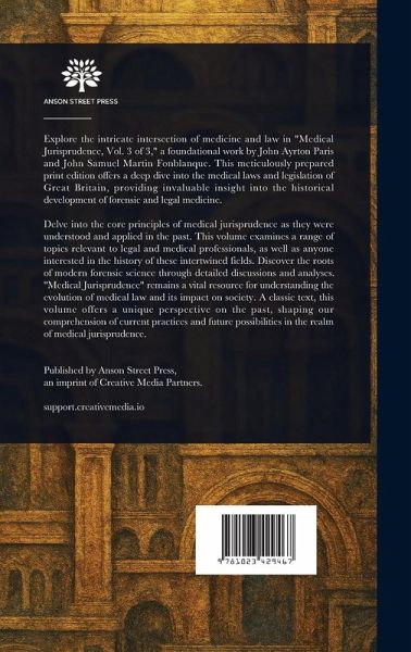 Explore the intricate intersection of medicine and law in "Medical Jurisprudence, Vol. 3 of 3," a foundational work by John Ayrton Paris and John Samuel Martin Fonblanque. This meticulously prepared print edition offers a deep dive into the medical laws and legislation of Great Britain, providing invaluable insight into the historical development of forensic and legal medicine. Delve into the core principles of medical jurisprudence as they were understood and applied in the past. This volume examines a range of topics relevant to legal and medical professionals, as well as anyone interested in the history of these intertwined fields. Discover the roots of modern forensic science through detailed discussions and analyses. "Medical Jurisprudence" remains a vital resource for understanding the evolution of medical law and its impact on society. A classic text, this volume offers a unique perspective on the past, shaping our comprehension of current practices and future possibilities in the realm of medical jurisprudence. This work has been selected by scholars as being culturally important, and is part of the knowledge base of civilization as we know it. This work is in the public domain in the United States of America, and possibly other nations. Within the United States, you may freely copy and distribute this work, as no entity (individual or corporate) has a copyright on the body of the work. Scholars believe, and we concur, that this work is important enough to be preserved, reproduced, and made generally available to the public. We appreciate your support of the preservation process, and thank you for being an important part of keeping this knowledge alive and relevant.