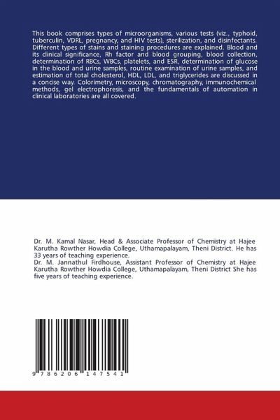 This book comprises types of microorganisms, various tests (viz., typhoid, tuberculin, VDRL, pregnancy, and HIV tests), sterilization, and disinfectants. Different types of stains and staining procedures are explained. Blood and its clinical significance, Rh factor and blood grouping, blood collection, determination of RBCs, WBCs, platelets, and ESR, determination of glucose in the blood and urine samples, routine examination of urine samples, and estimation of total cholesterol, HDL, LDL, and triglycerides are discussed in a concise way. Colorimetry, microscopy, chromatography, immunochemical methods, gel electrophoresis, and the fundamentals of automation in clinical laboratories are all covered.