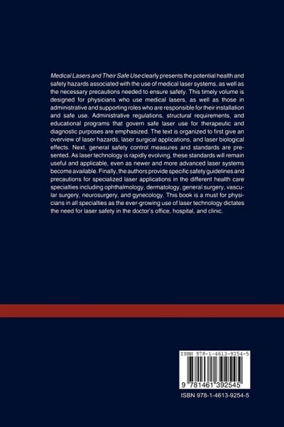 This text was designed for the physicians, nurses, technical personnel, and staff members of medical facilities using lasers for surgical, therapeutic, and diagnostic purposes. The objective is to provide an understanding of the potential health and safety hazards associated with the use of medical laser systems and the precautions needed to use them safely. To do this, it is necessary to have an awareness of applicable standargs and regula tions that apply to laser use. This book is not intended as a substitute for the American National Standards Institute (ANSI) Z-136. 3, "Safe Use of Lasers in Health Care Facilities," but to facilitate its implementation as well as the implementation of the many other related regulations and guidelines that are pertinent. These other regulations include the Medical Device Amendments to the Food and Drug Act, the Federal Laser Product Performance Standards issued under the Radiation Control for Health and Safety Act, and applicable regulations of the Occupational Safety and Health Administration (OSHA). The text is organized to provide first an overview of laser hazards, laser surgical applications, and laser biological effects. General safety control measures and safety standards are then presented. Because laser tech nology is rapidly evolving, these general guidelines will allow safe use of new laser systems as they become available. Finally, specific safety guide lines and precautions are provided for specialized laser applications in the different health care specialties.