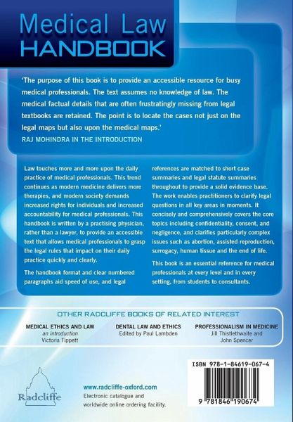 Law touches more and more upon the daily practice of medical professionals. This trend continues as modern medicine delivers more therapies, and modern society demands increased rights for individuals and increased accountability for medical professionals. This handbook is written by a practising physician and qualified lawyer to provide an accessible text that allows medical professionals to grasp the legal rules that impact on their daily practice quickly and clearly. The handbook format and clear numbered paragraphs aid speed of use, and legal references are matched to short case summaries and legal statute summaries throughout to provide a solid evidence base. The work enables practitioners to clarify legal questions in all key areas in moments. It concisely and comprehensively covers the core topics including confidentiality, consent, and negligence, and clarifies particularly complex issues such as abortion, assisted reproduction, surrogacy, human tissue and the end of life. This book is an essential reference for medical professionals at every level and in every setting, from students to consultants. 'The purpose of this book is to provide an accessible resource for busy medical professionals. The text assumes no knowledge of law. The medical factual details that are often frustratingly missing from legal textbooks are retained. The point is to locate the cases not just on the legal maps but also upon the medical maps.' Raj Mohindra in the Introduction