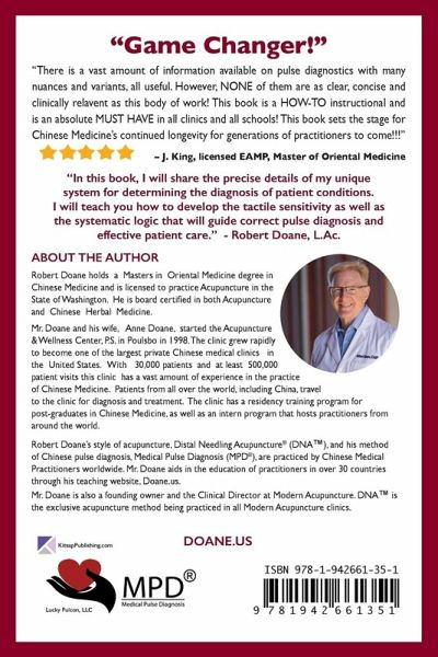 It is clear that the majority of Chinese Medicine practitioners lack confidence in their ability to correctly diagnose and treat patient illness in the clinical setting. For most, this is not due to a lack of intelligence or motivation, but rather an educational approach that insufficiently develops the diagnostic skills necessary to navigate complex patient cases. All practitioners need effective diagnostic skills to navigate the clinical setting and treat complex patient cases. With dedicated practice, Medical Pulse Diagnosis® (MPD®) will rapidly increase your skill and success in the field of Chinese Medicine. After many years of learning and refinement through the experiences of high-volume patient practice, I am sharing what I believe is the most effective pulse diagnostic system in the world today. In this book, I will share the precise details of this unique system for determining the correct diagnosis of patient conditions. I will teach you how to develop the tactile sensitivity as well as the systematic logic that will guide correct pulse diagnosis and effective patient care. This text applies to all Chinese Medicine practitioners and provides clinical value to any biomedical healthcare practitioner seeking palpable insights into patient conditions. These methods have produced diagnostic accuracy concerning the health of over 30,000 patients and 500,000 patient visits in the last twenty-one years. My goal is to contribute this same level of diagnostic expertise to your clinical practice and your patients. Robert Doane, L.Ac., EAMP, Dpl. Acupuncture and Chinese Herbal Medicine