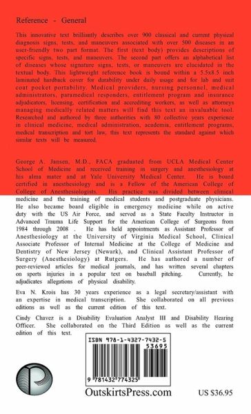 This innovative text brilliantly describes over 900 classical and current physical diagnosis signs, tests, and maneuvers associated with over 500 diseases in an user-friendly two part format. The first (text body) provides descriptions of specific signs, tests, and maneuvers. The second part offers an alphabetical list of diseases whose signature signs, tests, or maneuvers are elucidated in the textual body. This lightweight reference book is bound within a 5.5x8.5 inch laminated hardback cover for durability under daily usage and for lab and suit coat pocket portability. Medical providers, nursing personnel, medical administrators, paramedical responders, entitlement program and insurance adjudicators, licensing, certification and accrediting workers, as well as attorneys managing medically related matters will find this text an invaluable tool. Researched and authored by three authorities with 80 collective years experience in clinical medicine, medical administration, academia, entitlement programs, medical transcription and tort law, this text represents the standard against which similar texts will be measured. George A. Jansen, M.D., FACA graduated from UCLA Medical Center School of Medicine and received training in surgery and anesthesiology at his alma mater and at Yale University Medical Center. He is board certified in anesthesiology and is a Fellow of the American College of College of Anesthesiologists. His practice was divided between clinical medicine and the training of medical students and postgraduate physicians. He also became board eligible in emergency medicine while on active duty with the US Air Force, and served as a State Faculty Instructor in Advanced Trauma Life Support for the American College of Surgeons from 1984 through 2008 . He has held appointments as Assistant Professor of Anesthesiology at the University of Virginia Medical School, Clinical Associate Professor of Internal Medicine at the College of Medicine and Dentistry of New Jersey (Newark), and Clinical Assistant Professor of Surgery (Anesthesiology) at Rutgers. He has authored a number of peer-reviewed articles for medical journals, and has written several chapters on sports injuries in a popular text on baseball pitching. Currently, he adjudicates allegations of physical disability. Eva N. Krois has 30 years experience as a legal secretary/assistant with an expertise in medical transcription. She collaborated on all previous editions as well as the current edition of this text. Cindy Chavez is a Disability Evaluation Analyst III and Disability Hearing Officer. She collaborated on the Third Edition as well as the current edition of this text.