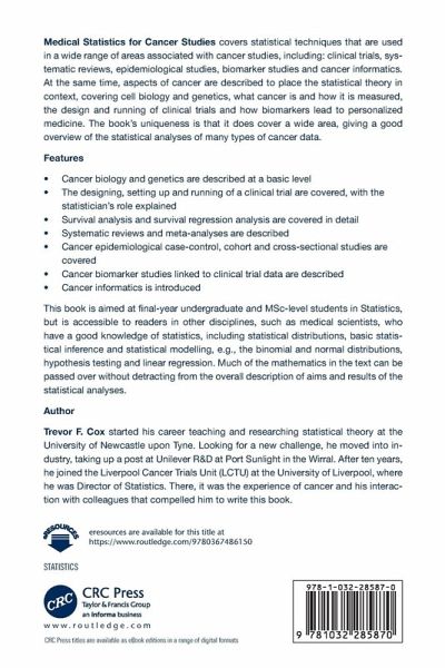 This textbook shows how cancer data can be analysed in a variety of ways, covering cancer clinical trial data, epidemiological data, biological data, and genetic data. It provides detailed overviews of survival analysis, clinical trials, regression analysis, epidemiology, meta-analysis, biomarkers, and cancer informatics.