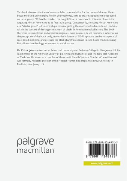 This book observes the idea of race as a false representation for the cause of disease. Race-based medicine, an emerging field in pharmacology, aims to create a specialty market based on racial groups. Within this market, the drug BiDil set a precedent in this area of medicine targeting African Americans as its first racial group. Consequently, selecting African Americans as a "starter group" led to ethical questions regarding the motive behind race-based medicine within the context of the larger treatment of blacks in American medical history. This book therefore links medicine and American eugenics, examines race-based medicine's influence on the perception of the black body, traces the influence of BiDil's approval on the resurgence of race-based medicine, and assesses the black church's response to race-based medicine using black liberation theology as a means to social justice.
