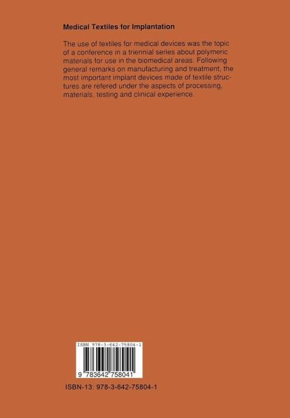 I. General Aspects.- 1. General Aspects in the Use of Medical Textiles for Implantation.- 2. In Vitro Evaluation of the Effects of Macrophages and Synthetic Materials on the Fibroblast Proliferation and Collagen Synthesis.- 3. Contributions to Biocompatibility during Hemodialysis.- 4. Macroporous Textile and Microporous Nonwoven Vascular Prostheses: Histological Aspects of Cellular Ingrowth into the Structure.- 5. Cytotoxicity Tests in the Biological Evaluation of Medical Devices.- 6. Fact Database Mediplast. Polymers in Medicine.- 7. The Central Register for Side Effects of Biomaterials.- II. Ligaments and Tendons.- 8. Influence of Processing Parameters for Artificial Ligaments.- 9. Treatment of Ligamentous Instabilities of the Knee-Joint under the Special Aspect of Prosthetic Ligament Reconstruction.- 10. Histology of Aramide Cords (Kevlar {R}) Used as a Cruciate Knee Ligament Substitute in the Sheep.- 11. Mechanical Properties of Various Ligament Prostheses.- III. Vascular Prostheses.- 12. Dilatability and Stretching Characteristics of Polyester Arterial Prostheses. Evaluation of the Elastic Behaviour.- 13. Polyurethanes and Their Cytocompatibility for Cell Seeding.- 14. Cellular and Cytoskeletal Response of Vascular Cells to Mechanical Stimulation.- 15. Perigraft Reaction of Vascular Prosthetic Grafts and Therapeutic Management.- IV. Sutures.- 16. The Historical Development of Sutures Comparing the Manufacturing Process, Handling Characteristics and Biocompatibility.- 17. Test Methods for Surgical Sutures.- 18. The Effect of Bacteria on the Degradation of Absorbable Sutures.- V. Bioartificial Organs.- 19. Bioartificial Endocrine Pancreas. Prerequisites and Current Status.- 20. Improvement of Insulin Diffusion by Protein Coating of Membranes for Use in a Bioartificial Pancreas.- 21. Polymeric Membranes for Use in a Bioartificial Diffusion Pancreas: Insulin Diffusion in Vitro.- 22. Morphological and Functional Studies on Implanted Diffusion Membranes.- 23. First Experiences on Epithelialisation of an Expanded PTFE Tracheal Prosthesis.- 24. Proliferation and Differentiation of Human Ciliated Epithelia on PTFE-Prostheses.- VI. Artificial Skin and Patches.- 25. Controlled Microporosity: A Key Design Principle for Artificial Skin.- 26. A New Kind of Collagen Membrane to be Used as Long Term Skin Substitute.- 27. The Gore-Tex Surgical Membrane for Temporary Skin Closure after Complicated Cardiac Operations.- 28. Pathological Analysis of the Explanted Gore-Tex Surgical Membrane after Surgical Implantation.- 29. Bioabsorbable Non-Woven Fabric for Surgery.- 30. Water Vapor and Oxygen Permeabilities of Polyetherurethanes.- Roundtable Discussion at the End of the Conference.- Keywords.- Author Index.