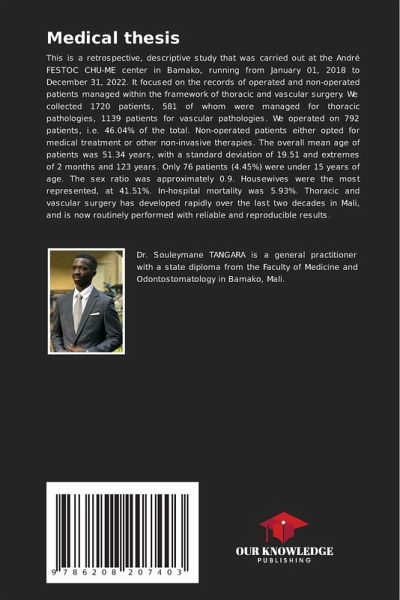 This is a retrospective, descriptive study that was carried out at the André FESTOC CHU-ME center in Bamako, running from January 01, 2018 to December 31, 2022. It focused on the records of operated and non-operated patients managed within the framework of thoracic and vascular surgery. We collected 1720 patients, 581 of whom were managed for thoracic pathologies, 1139 patients for vascular pathologies. We operated on 792 patients, i.e. 46.04% of the total. Non-operated patients either opted for medical treatment or other non-invasive therapies. The overall mean age of patients was 51.34 years, with a standard deviation of 19.51 and extremes of 2 months and 123 years. Only 76 patients (4.45%) were under 15 years of age. The sex ratio was approximately 0.9. Housewives were the most represented, at 41.51%. In-hospital mortality was 5.93%. Thoracic and vascular surgery has developed rapidly over the last two decades in Mali, and is now routinely performed with reliable and reproducible results.