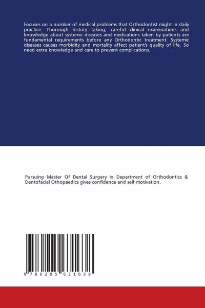 Focuses on a number of medical problems that Orthodontist might in daily practice. Thorough history taking, careful clinical examinations and knowledge about systemic diseases and medications taken by patients are fundamental requirements before any Orthodontic treatment. Systemic diseases causes morbidity and mortality affect patient's quality of life. So need extra knowledge and care to prevent complications.