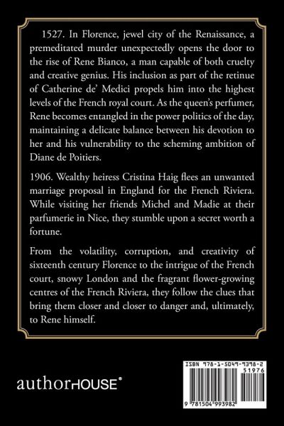 1527. In Florence, jewel city of the Renaissance, a premeditated murder unexpectedly opens the door to the rise of Rene Bianco, a man capable of both cruelty and creative genius. His inclusion as part of the retinue of Catherine de' Medici propels him into the highest levels of the French royal court. As the queen's perfumer, Rene becomes entangled in the power politics of the day, maintaining a delicate balance between his devotion to her and his vulnerability to the scheming ambition of Diane de Poitiers. 1906. Wealthy heiress Cristina Haig flees an unwanted marriage proposal in England for the French Riviera. While visiting her friends Michel and Madie at their parfumerie in Nice, they stumble upon a secret worth a fortune. From the volatility, corruption, and creativity of sixteenth century Florence to the intrigue of the French court, snowy London and the fragrant flower-growing centres of the French Riviera, they follow the clues that bring them closer and closer to danger and, ultimately, to Rene himself.