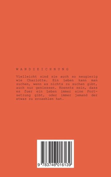 W A N D Z E I C H N U N G .Vielleicht sind sie auch so neugierig wie Charlotte. Ein Leben kann man suchen, wenn es nichts zu suchen gibt, auch nur genießen. Könnte sein, dass es für ein Leben immer eine Fortsetzung gibt, oder immer jemand der etwas zu erzählen hat.