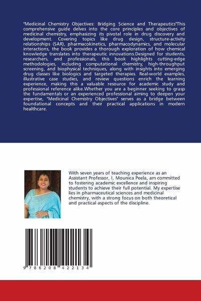 "Medicinal Chemistry Objectives: Bridging Science and Therapeutics"This comprehensive guide delves into the core principles and objectives of medicinal chemistry, emphasizing its pivotal role in drug discovery and development. Covering topics like drug design, structure-activity relationships (SAR), pharmacokinetics, pharmacodynamics, and molecular interactions, the book provides a thorough exploration of how chemical knowledge translates into therapeutic innovations.Designed for students, researchers, and professionals, this book highlights cutting-edge methodologies, including computational chemistry, high-throughput screening, and biophysical techniques, along with insights into emerging drug classes like biologics and targeted therapies. Real-world examples, illustrative case studies, and review questions enrich the learning experience, making this a valuable resource for academic study and professional reference alike.Whether you are a beginner seeking to grasp the fundamentals or an experienced professional aiming to deepen your expertise, "Medicinal Chemistry Objectives" serves as a bridge between foundational concepts and their practical applications in modern healthcare.