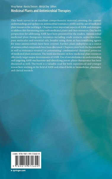 This book serves as an excellent comprehensive material covering the current understandings and updates on antimicrobial resistance (AMR) and the use of medicinal plant resources for tackling it. Chapters cover important aspects of AMR and strategies to address this threatening issue with medicinal plants and their resources. One health perspectives for addressing AMR have been presented for the readers. Antimicrobial medicinal plant therapeutic resources including crude extracts, active fractions, pure molecules and essential oils, besides using them as functionalizing agents for nano-antimicrobials have been covered. Further, plant endophytes as a source of antimicrobial compounds have been discussed. Chapters cover both the bactericidal as well as resistance-reversal (or potentiating/ combinatorial therapies) potencies of medicinal plant resources. The book also focuses on how medicinal plant resources effectively target major determinants of AMR. Use of metabolomics in understanding and targeting AMR mechanisms and identifying potent phyto-therapeutics has been discussed as well. The book is a valuable read for both experienced and younger researchers working in the field of AMR and related fields in biomedicine, pharmacy, and clinical research.