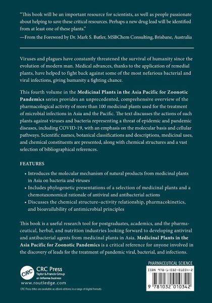 This fourth volume in the Medicinal Plants in the Asia Pacific for Zoonotic Pandemics series provides an unprecedented, comprehensive overview of the pharmacological activity of more than 100 medicinal plants used for the treatment of microbial infections in Asia and the Pacific. The text discusses the actions of such plants against viruses and bacteria representing a threat of epidemic and pandemic diseases, including COVID-19, with an emphasis on the molecular basis and cellular pathways. Scientific names, botanical classifications and descriptions, medicinal uses, and chemical constituents are presented, along with chemical structures and a vast selection of bibliographical references.
