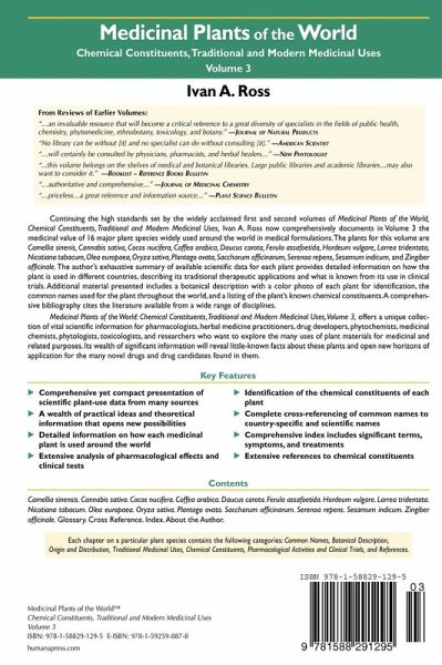 "Ivan A. Ross has authored volume 3, covering many details of 16 important plant species used around the world in medicinal preparations and/or dietary supplements. This is timely because the use of herbal medicines and nutritional supplements is on the rise. ... a valuable resource and is a critical reference for researchers in phytomedicine, medicinal chemistry, pharmacology, herbal medicine, toxicology, and botany. The volume belongs on the shelves of libraries of institutes ofpharmacy, medicinal chemistry, and botany." (Govind J. Kapadia, Journal of Medicinal Chemistry, Vol. 49 (13), June, 2006)