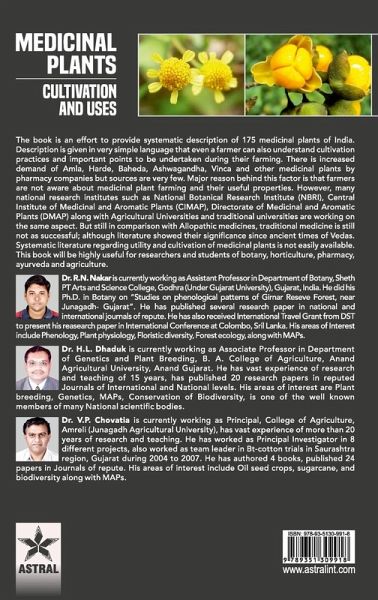 The book entitled "Cultivation and Uses of Medicinal Plants" is an effort to provide systematic description of 175 medicinal plants of India. Description is given in very simple language that even a farmer can also understand cultivation practices and important points to be undertaken during their farming. There is increased demand of Amla, Harde, Baheda, Ashwagandha, Vinca and other medicinal plants by pharmacy companies but sources are very few. Major reason behind this factor is that farmers are not aware about medicinal plant farming and their useful properties. However, many national research institutes such as National Botanical Research Institute (NBRI), Central Institute of Medicinal and Aromatic Plants (CIMAP), Directorate of Medicinal and Aromatic Plants (DMAP) along with Agricultural Universities and traditional universities are working on the same aspect. But still in comparison with Allopathic medicines, traditional medicine is still not as successful; although literature showed their significance since ancient times of Vedas. Systematic literature regarding utility and cultivation of medicinal plants is not easily available. This book will be highly useful for researchers and students of botany, horticulture, pharmacy, ayurveda and agriculture.