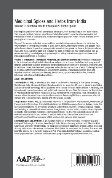 Details information on twenty specific exotic Indian spices. It focuses on individual spices and their uses in treating various diseases. In particular, the volume explores the impacts and uses of black cumin, celery, black stone flowers, chili pepper, Asian spider flower, alkanet, kapok tree, pomegranate, fenugreek, musk, and more.