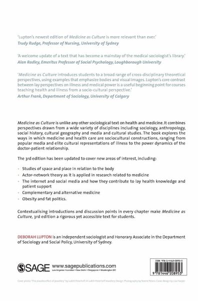 This new edition of Medicine as Culture is a welcome updating of a text that has become a mainstay of the medical sociologist's library. Providing a clear statement of the emergence and role of medicine in cultural contexts, Deborah Lupton offers excellent summaries and comparisons of the major theoretical perspectives that illuminate our understanding of illness, the body and its social care. Students and teachers will appreciate the clarity and organisation of this book, which confirm it as a leading text in its field