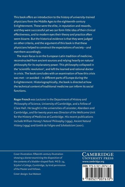 This book is an introduction to the history of university-trained physicians from the Middle Ages to the eighteenth-century Enlightenment. While considered elite (in reputation and rewards) and successful, we know little of their clinical effectiveness. To modern eyes their theory and practice often seems bizarre. But historical evidence reveals that they were judged on other criteria, and this book asserts that these physicians helped to construct and meet the expectations of society.