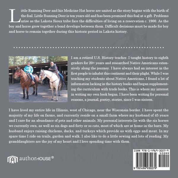 Little Running Deer and his Medicine Hat horse are united as the story begins with the birth of the foal. Little Running Deer is ten years old and has been promised this foal at a gift. Problems arise as the Lakota Sioux tribe face the difficulties of living on a reservation c. 1900. As the boy and horse grow together a bond develops between them. Difficult decisions must be made for boy and horse to remain together during this historic period in Lakota history.